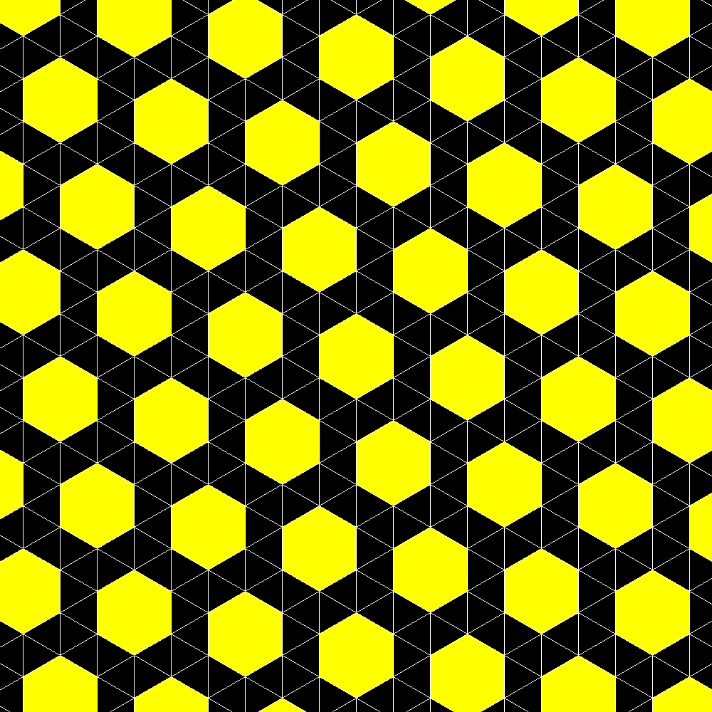 | Tassellazione semiregolare 3636 del piano. Il nome dipende dal fatto che in ogni punto del piano così tassellato insistono triangolo e esagono per due volte. Da questa tassellazione, frastagliando gli esagoni con merletti di Koch introflessi (oppure i triangoli con merletti estroflessi) si ottiene la tassellazione con fiocchi di neve di due diverse taglie mostrata sopra. |