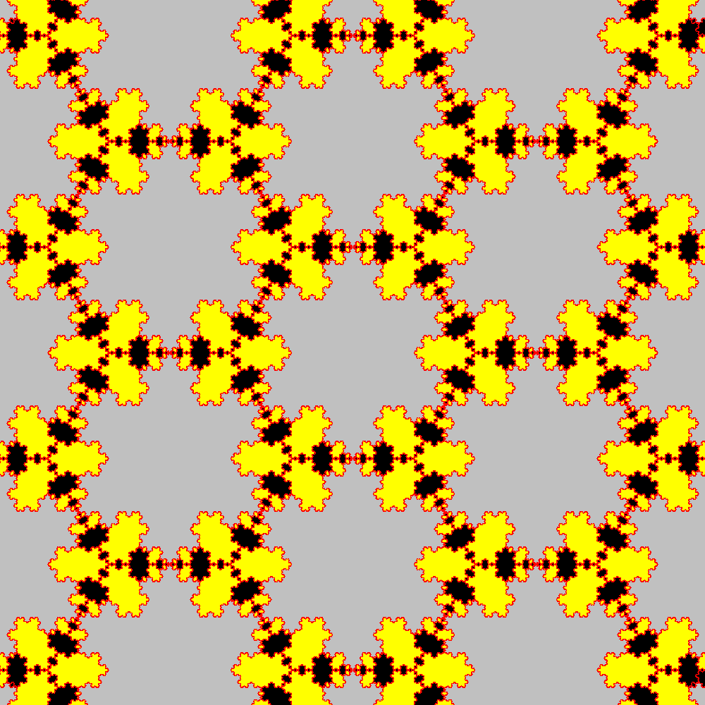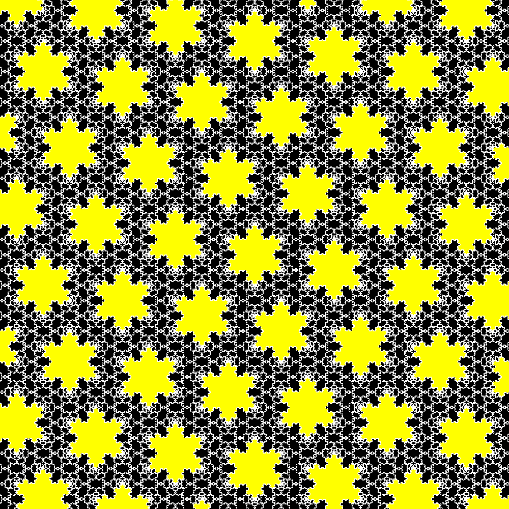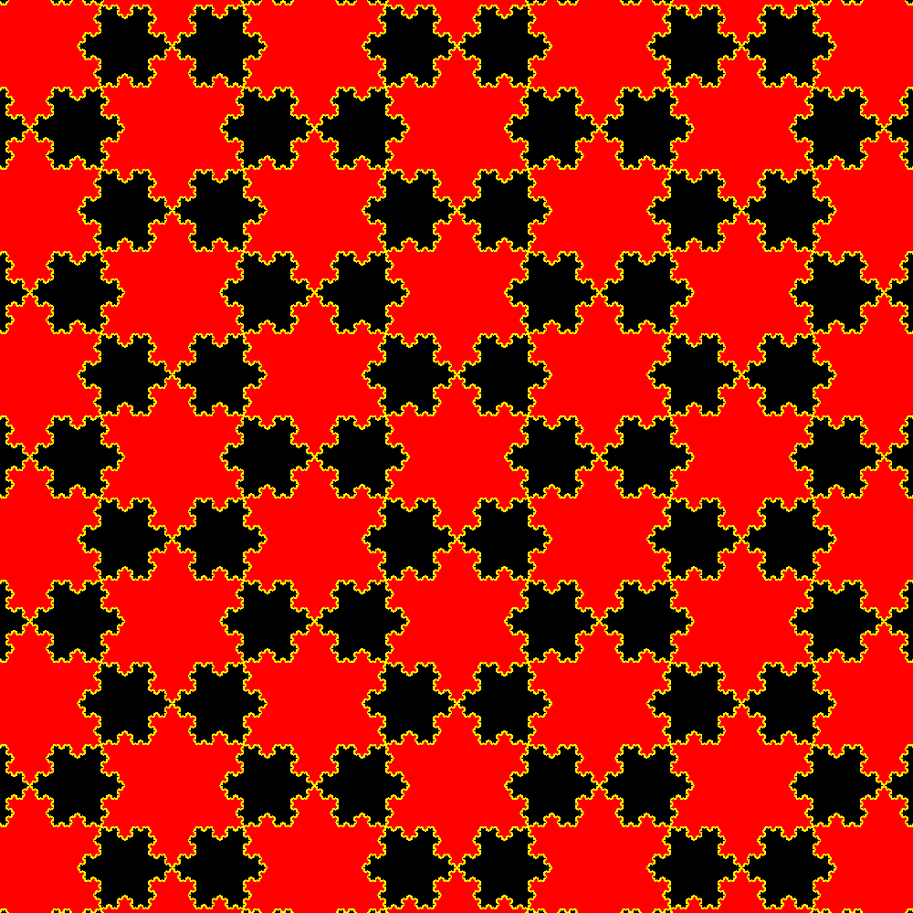 Tassellazione del piano con classici fiocchi di neve (Koch snowflakes) di due diverse taglie. Il rosso ha un area tripla di quella del nero. |